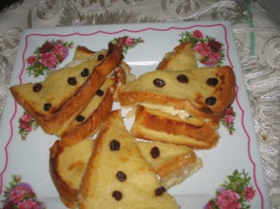 2. Funika moja juu ya mwenziwe kisha kata slesi za mkate ziwe vipande vya pembe tatu.